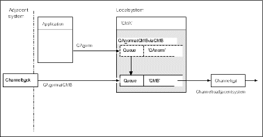 In a distributed-queuing environment, a transmission queue and channel are the focal point for all messages to a location whether the messages originate from applications in your local system, or arrive through channels from an adjacent system. This is shown in Figure 19 where an application is placing messages on a logical queue named 'QA_norm'. The name resolution uses the remote queue definition 'QA_norm' to select the transmission queue 'QMB', and adds a transmission header to the messages stating 'QA_norm at QMB'.